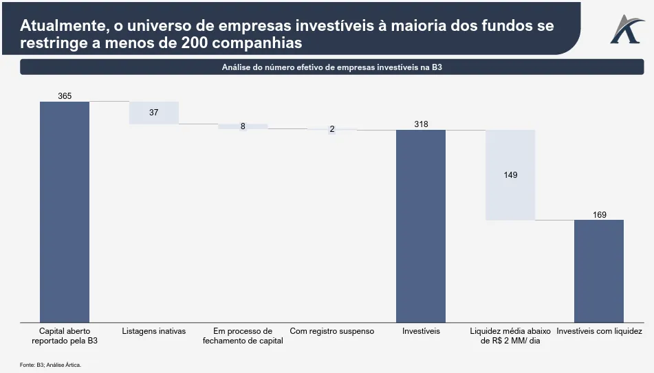 Quando analisamos o atual universo de empresas listadas, menos da metade das firmas de capital aberto é realmente investível para a maioria dos gestores institucionais.