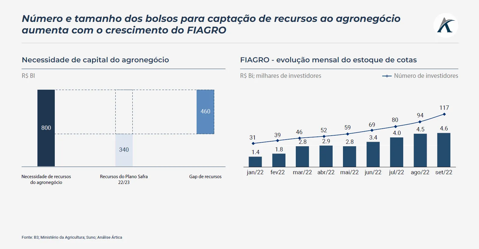 Por conta dos ciclos de safra e da elevada necessidade de investimentos, o agronegócio demanda altos volumes de financiamento. Parte dessa necessidade é atendida por programas do governo, como o Plano Safra, mas o crescimento do setor têm feito produtores buscarem o mercado de capitais.