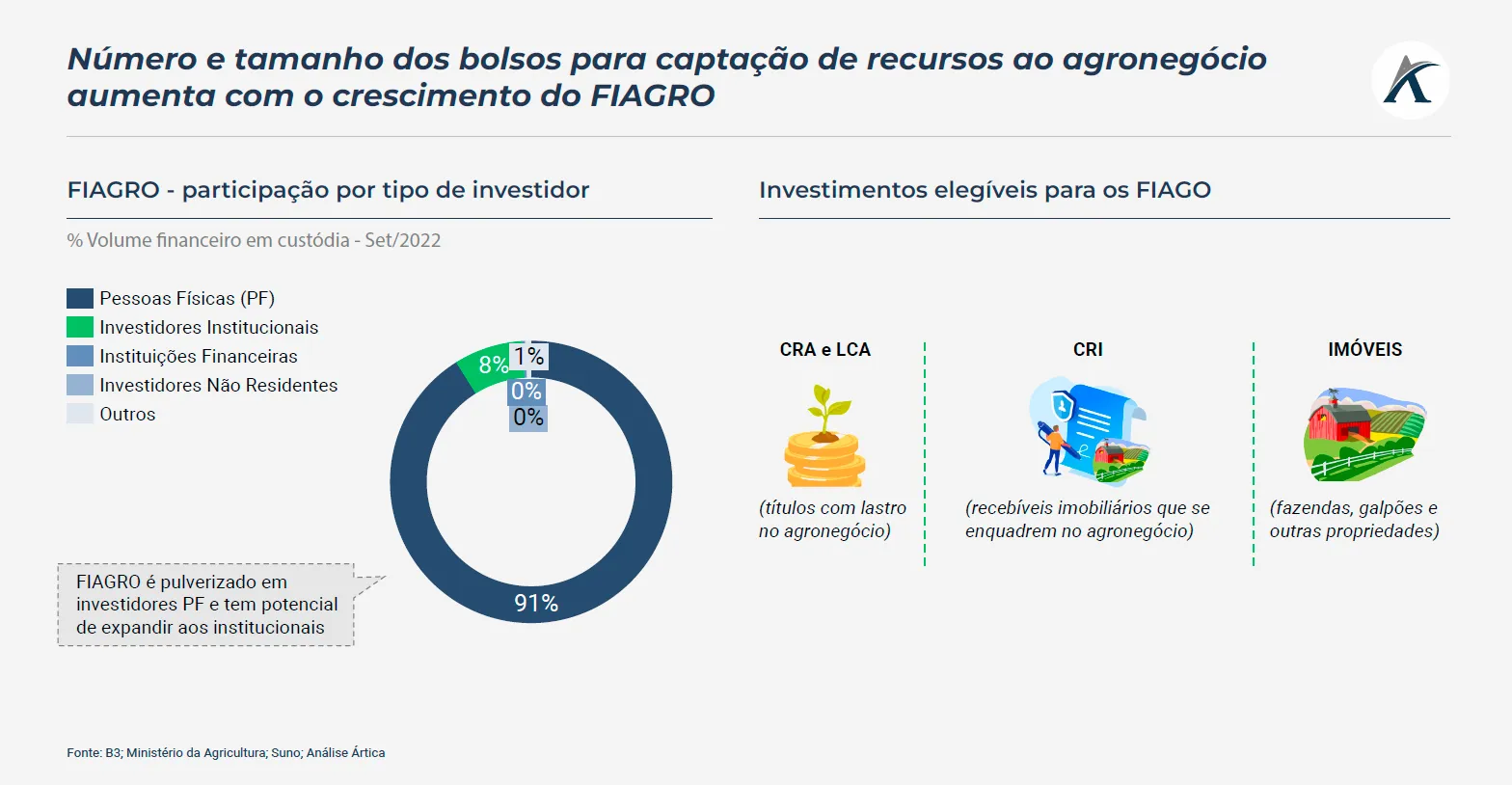 Criado em agosto/2021, o Fundo de Investimento nas Cadeias Produtivas Agroindustriais é um produto que abre novas possibilidades de captação de recursos para o agronegócio. Em pouco mais de 1 ano de criação, o FIAGRO acumula mais de 100 mil investidores – e deve se tornar uma das principais pontes entre o investidor Pessoa Física e o setor agrícola. A pulverização de bolsos significa maior liquidez para uma série de ativos – financeiros e reais (imóveis rurais) – e fomento mais poderoso do que o governo é capaz de fornecer.