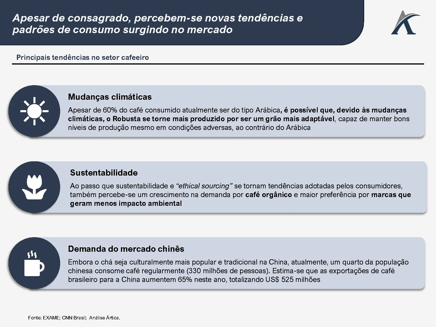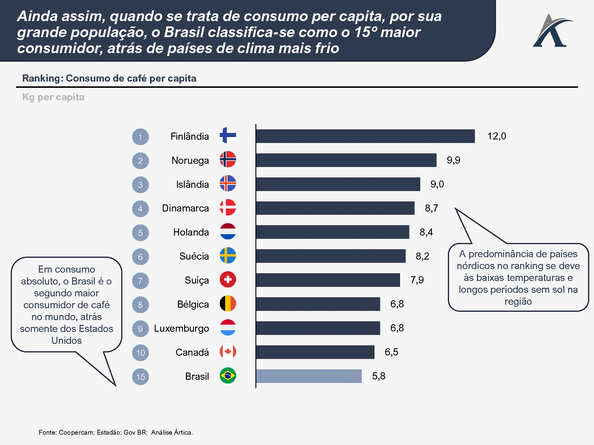 A popularidade do café como fenômeno cultural global reflete as transformações sociais, econômicas e ambientais em todo o mundo. A demanda por café tem aumentado, acompanhada pela crescente popularidade das cafeterias e drinks com café, o fortalecimento da tradição social de “tomar um cafezinho” e a associação do consumo de cafeína com maior produtividade.