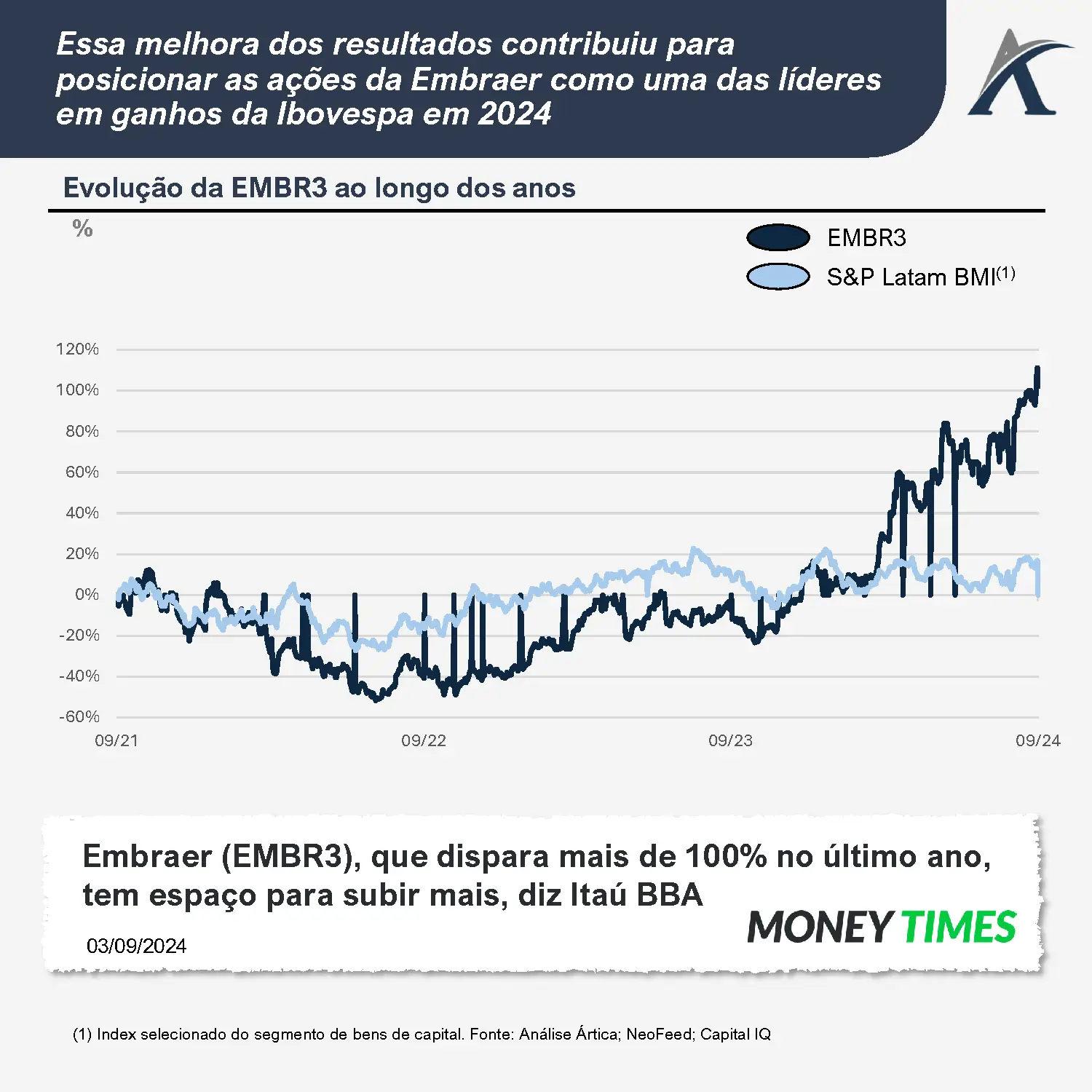 Combinado com o aumento na entrega de aeronaves, esse crescimento da companhia resultou em uma cobertura positiva dos bancos de investimento, o que gerou uma significativa valorização de suas ações e a colocou como uma das líderes da Ibovespa.