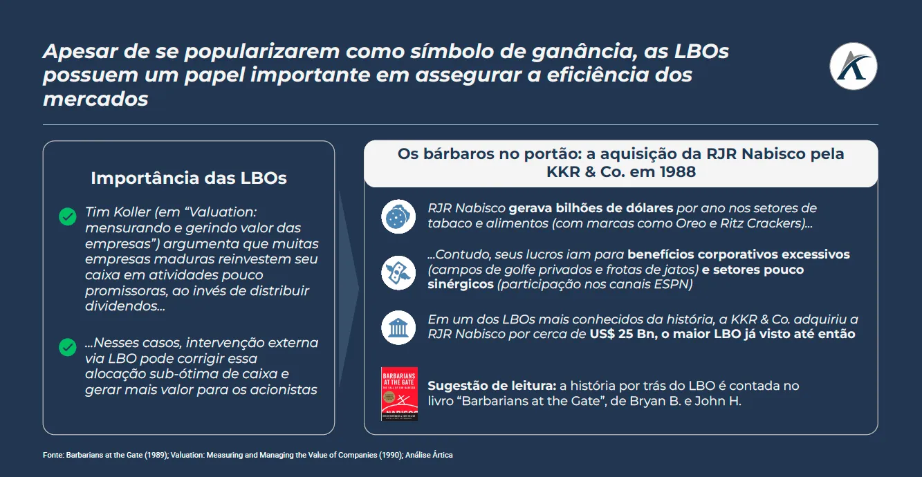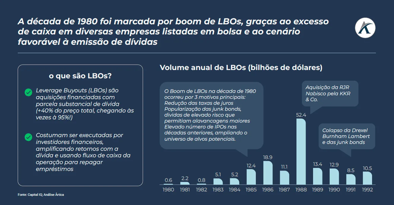 LBOs marcaram a década de 1980 dos mercados de capitais, com o caso mais famoso ocorrendo em 1988, quando a firma de private equity Kohlberg Kravis Roberts & Co. adquiriu a RJR Nabisco por US$ 25 Bn, o maior LBO já visto até então. O winning bid da KKR pôs fim a negociações que envolveram, essencialmente, todos os grandes bancos de investimento de Wall Street e que foram descritas no livro “Barbarians at the Gate” (1989) como um “embate de egos jamais visto” entre Henry Kravis (Managing Partner da KKR) e Ross Johnson (CEO da RJR Nabisco).