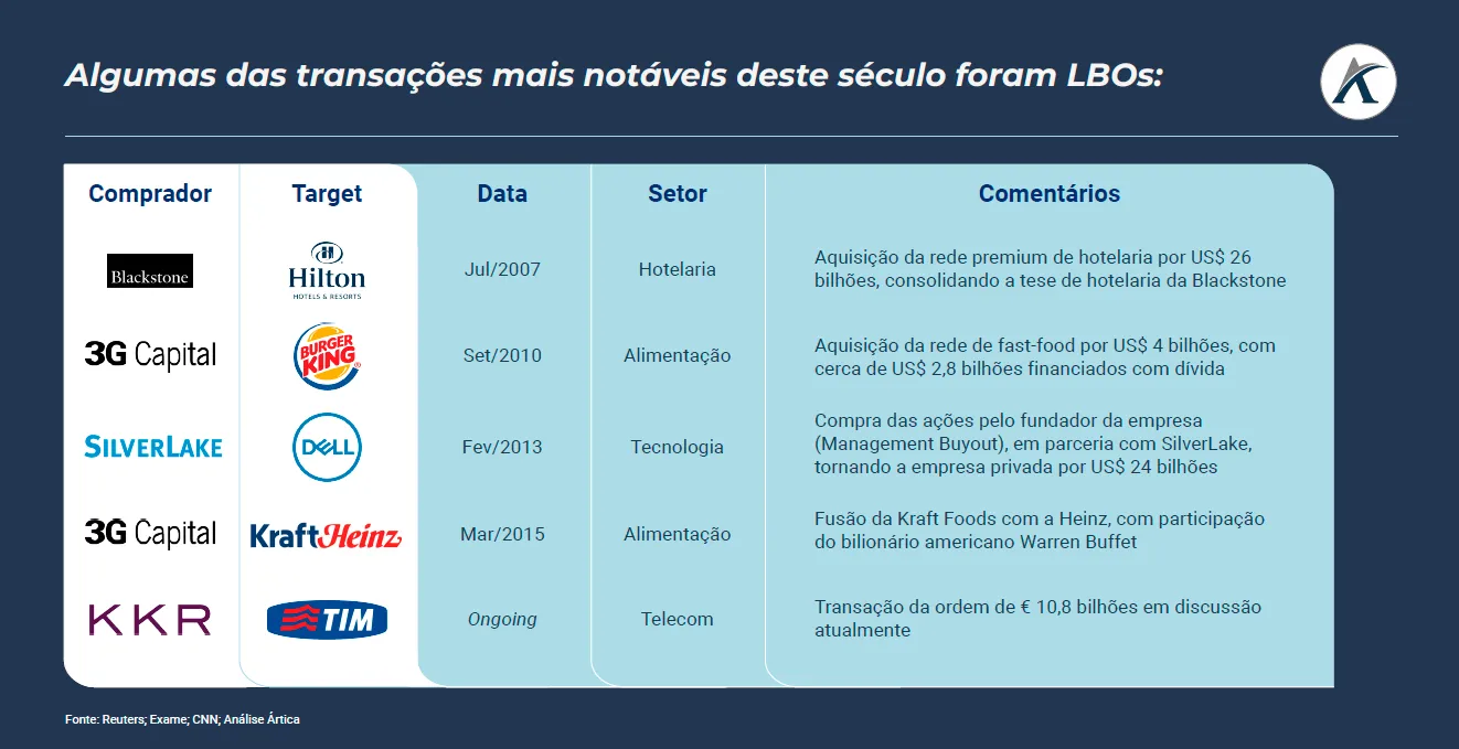 O uso de dívida para financiar aquisições (LBOs) é uma alavanca que pode ser utilizada por investidores financeiros para amplificar seus retornos.
