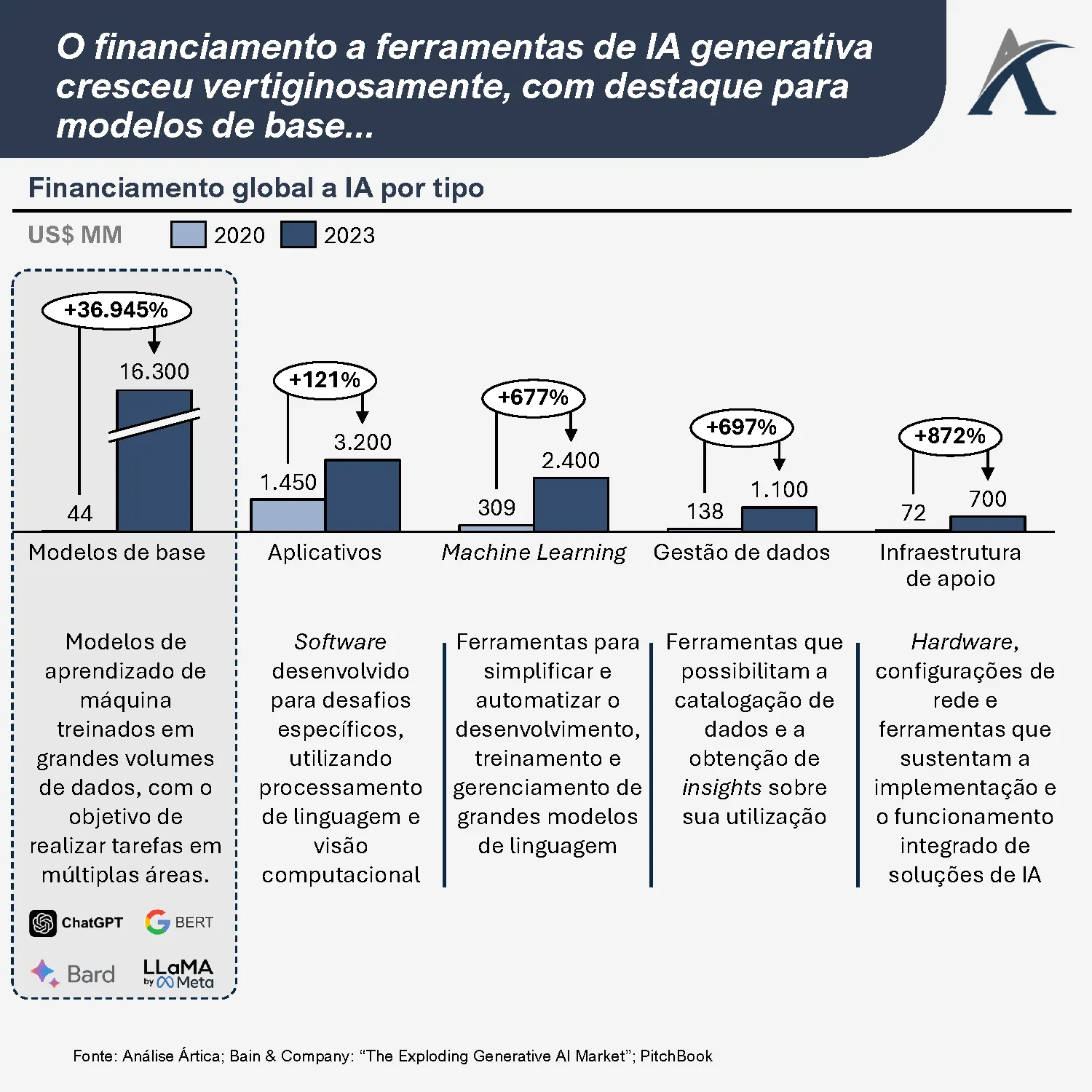Entre 2020 e 2023, o financiamento nesse setor cresceu quase 12 vezes, com foco nos modelos de base – redes neurais treinadas a partir de bases de dados massivas. Esses modelos são capazes de realizar tarefas diversas em diferentes áreas do conhecimento – como é o caso do ChatGPT e do LLaMA (modelo utilizado pela MetaAI, agora disponível para alguns usuários do WhatsApp no Brasil).