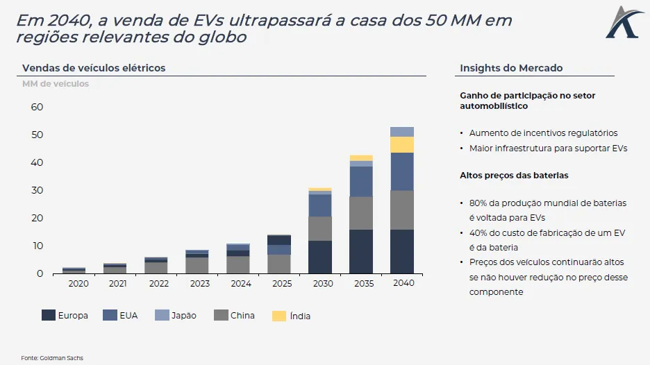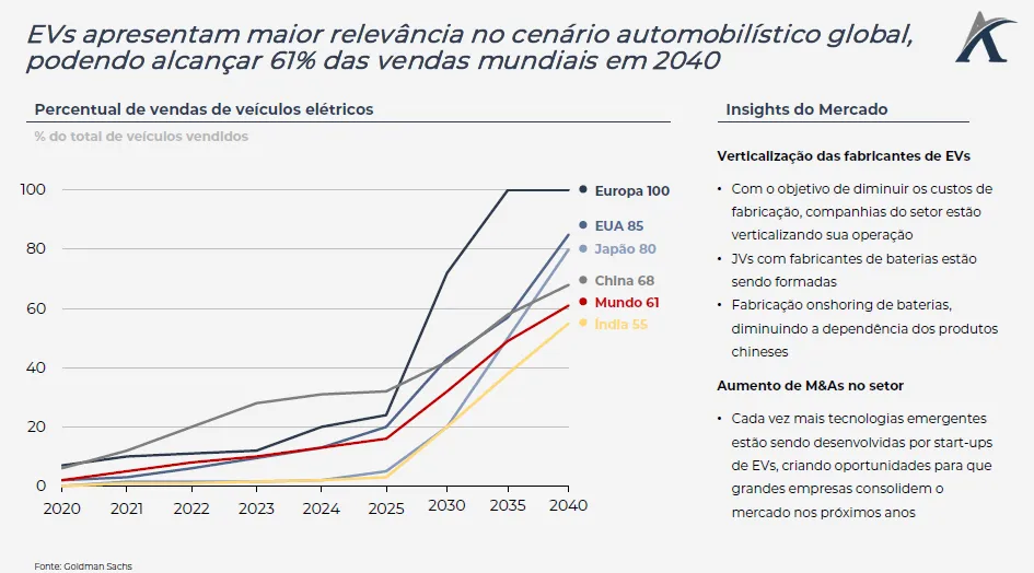 De acordo com uma pesquisa do Goldman Sachs, em 2035 a venda de veículos elétricos irá representar 50% das vendas globais de veículos. Nesse mesmo ano, a Europa terá 100% de suas vendas de carros representadas por veículos movidos a bateria.