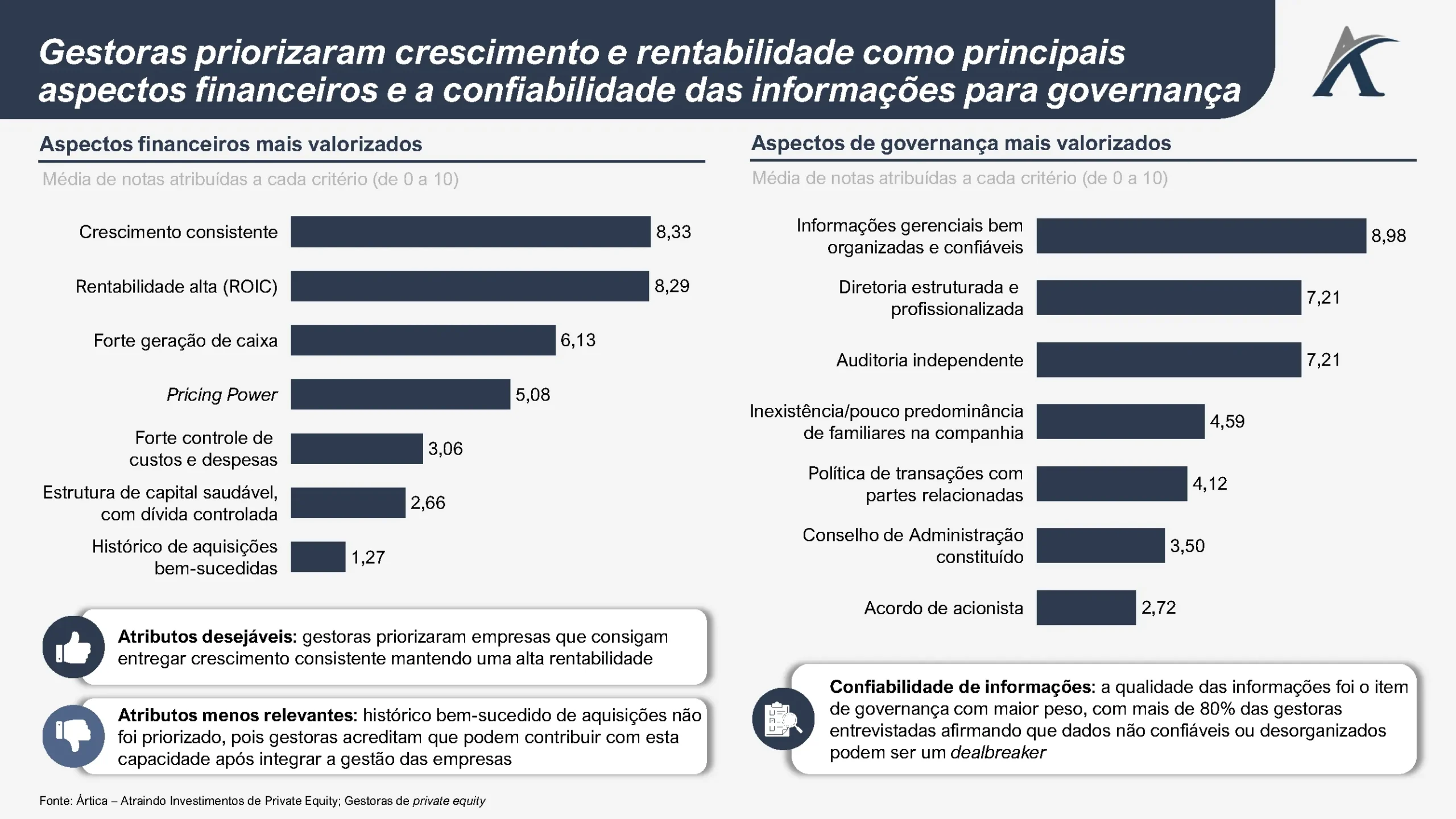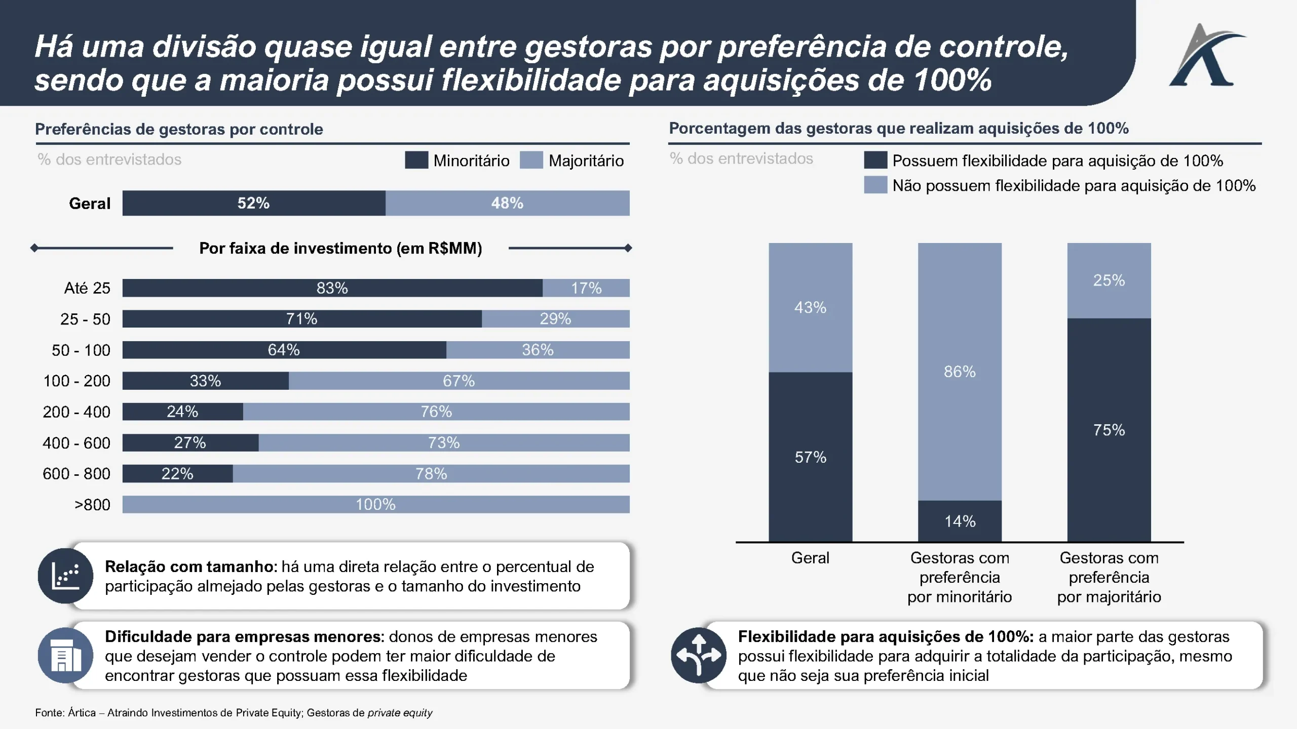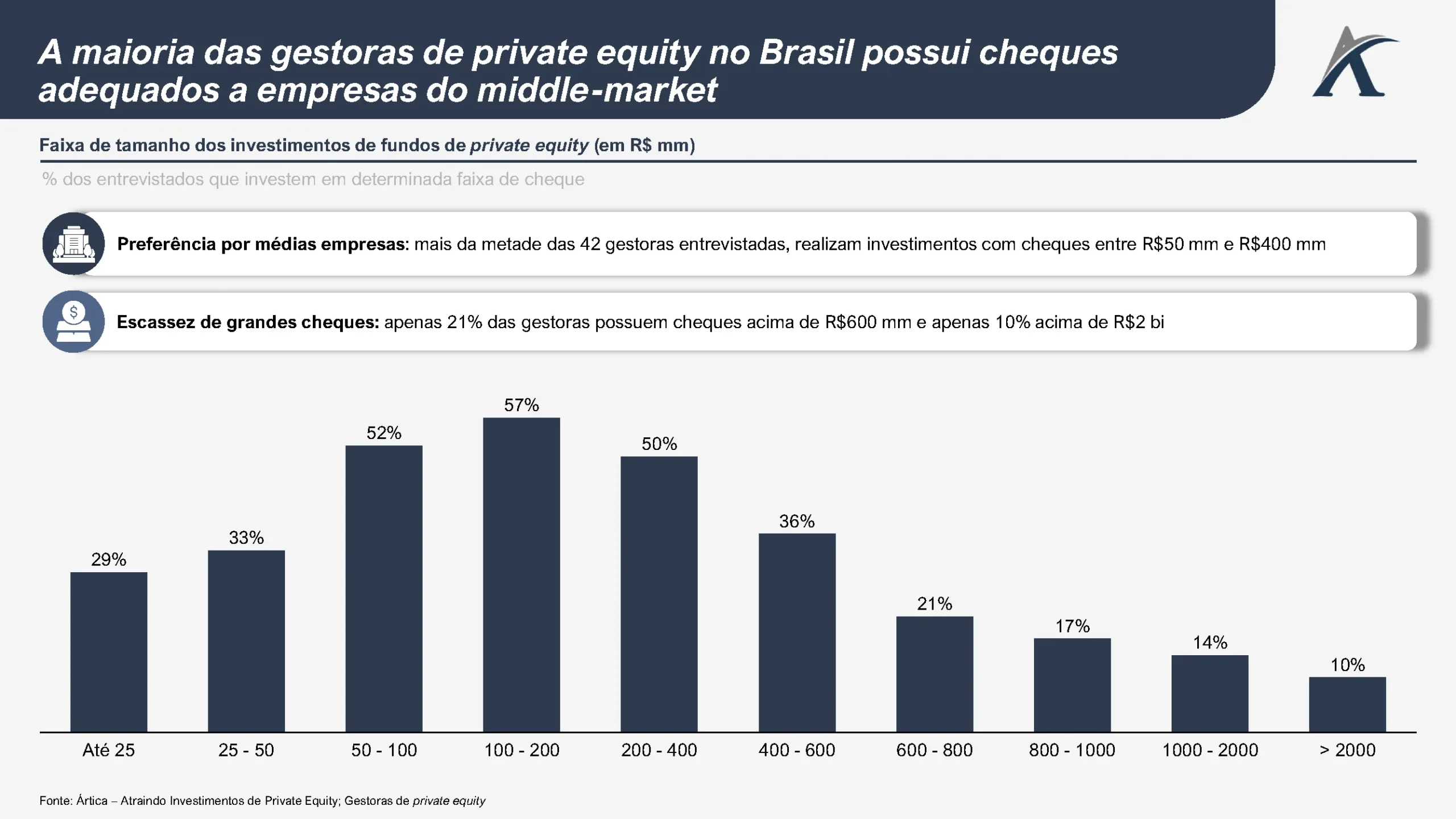 O Ártica realizou um estudo com gestoras de Private Equity para mapear suas preferências em investimentos. O estudo contou com 42 gestoras, representando 45% das que estão em atividade no momento da realização da pesquisa, somando R$ 105 bilhões de capital investido, que equivale a 58% do total estimado pela indústria no Brasil.