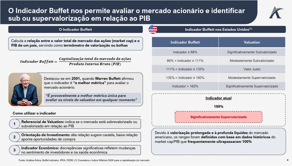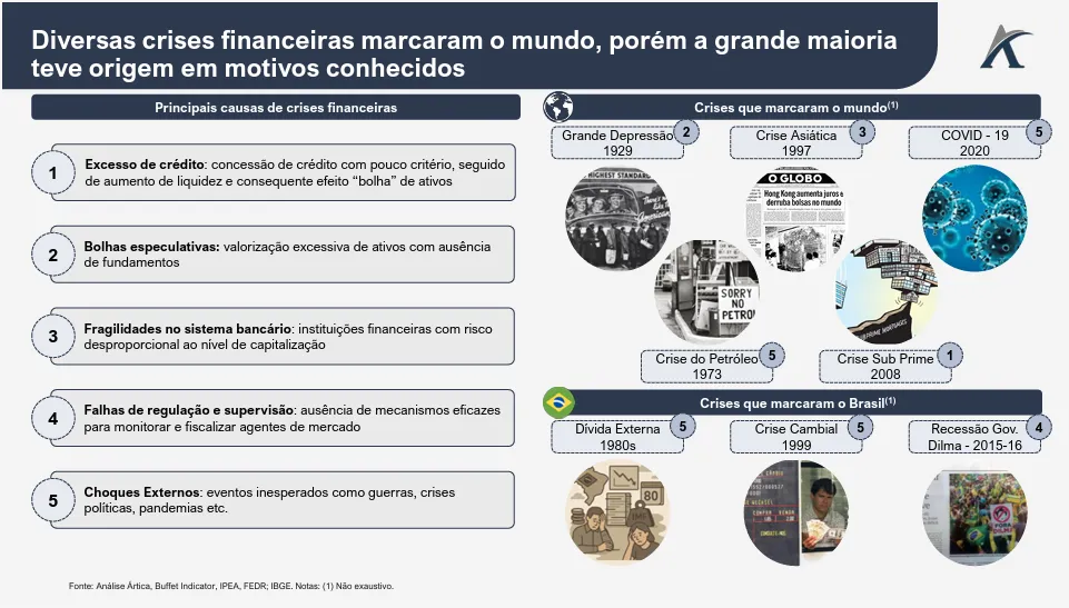 Os motivadores dessas crises podem ser variados, desde colapsos bancários até choques externos, e um indicador que auxilia a dimensionar a magnitude desses efeitos é o Buffett Indicator, que relaciona o valor total do mercado acionário ao PIB de um país.