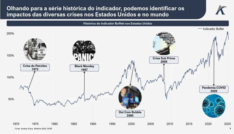 Por isso, é especialmente interessante examinar a série histórica do Indicador Buffett nos Estados Unidos e sua evolução frente às principais crises financeiras ocorridas ao longo do tempo, investigando de que forma seus picos e recuos podem ter sinalizado momentos de sobrevalorização ou antecipado períodos de turbulência no mercado.
