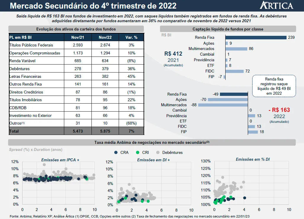 Na contramão do aquecimento de oferta observado no mercado primária de crédito privado, em 2022, ocorreu a saída líquida de R$ 163 bilhões nos fundos de investimento com saques líquidos também registrados em fundos de renda fixa.