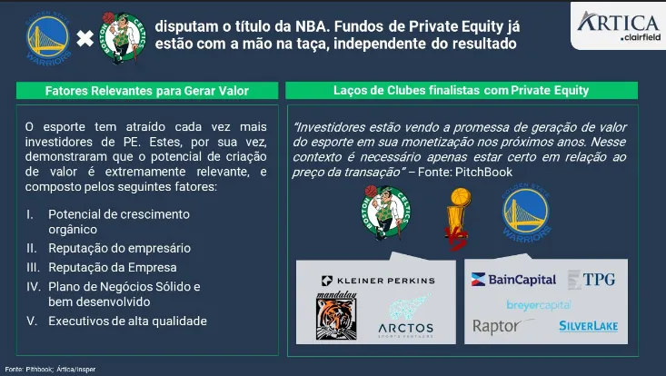Na pílula de hoje captamos um momento peculiar onde times afiliados a PE’s disputam as finais da NBA ao mesmo tempo que revisitamos os principais pontos a se ter em conta na atração desses investidores que foram estudados em detalhe no estudo publicado pelo Ártica em 2020 “Atraindo Investimentos de Private Equity – O que é mais valorizado pelas gestoras”. Confira no link: