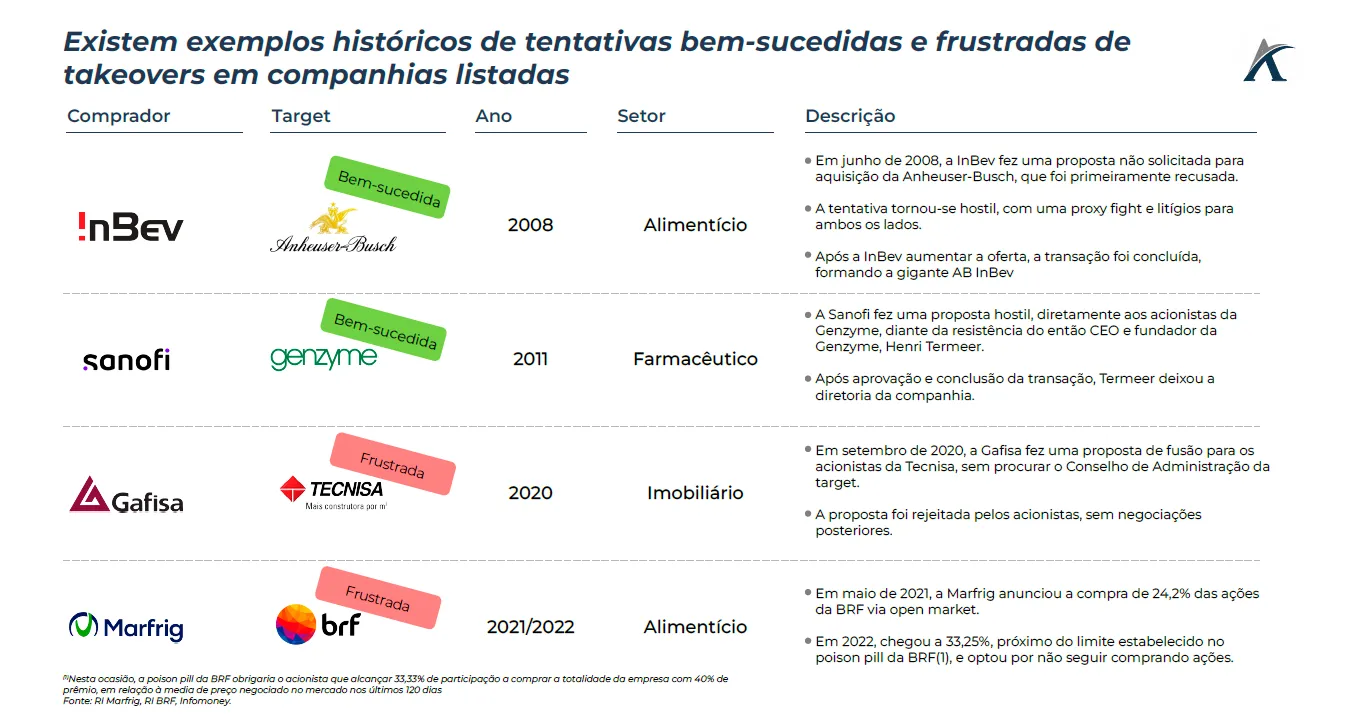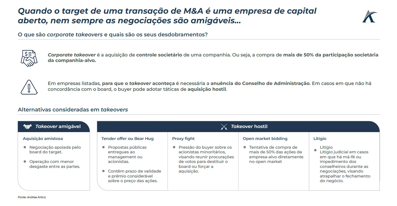 Em aquisições hostis, normalmente, a diretoria e/ou o Conselho de Administração da companhia-alvo não têm interesse na venda de controle da empresa, e o comprador passa a buscar outras formas de concluir a transação em detrimento de uma aquisição amigável.
