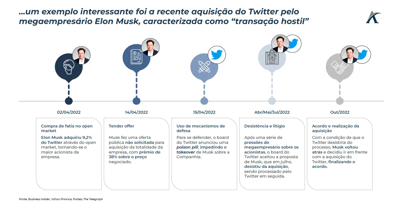 A aquisição do Twitter por Elon Musk começou em abril e foi concluída apenas em outubro de 2022. Nesse período, a companhia e o empresário travaram uma série de disputas: de forma silenciosa, Musk se tornou o maior acionista da empresa; em seguida, anunciou a aquisição total; desistiu; foi processado; e, por fim, voltou atrás em sua desistência e concluiu a transação. Processos como este, caracterizados pela tentativa de aquisição forçada de controle de uma empresa de capital aberto, são chamados de transação hostil ou hostile takeover.