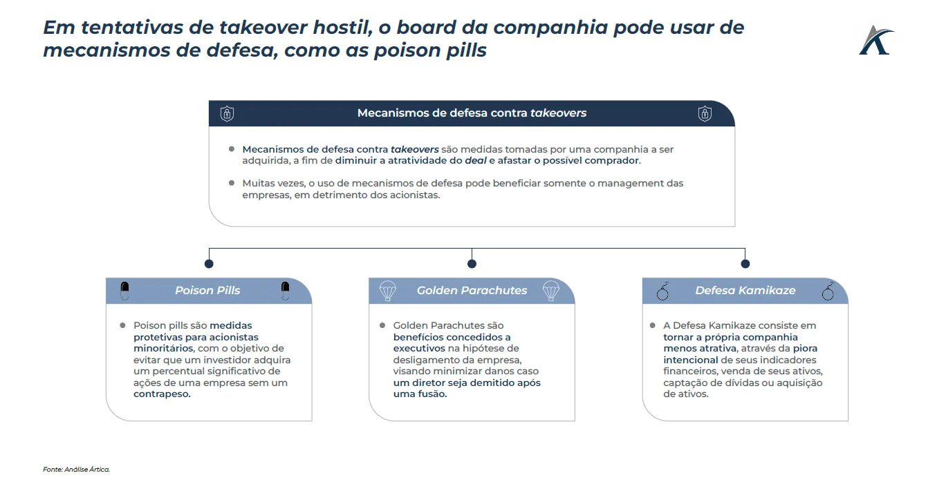 Apesar disso, em tentativas de hostile takeover, as companhias-alvo podem usar de mecanismos de defesa conhecidos. No processo entre o Twitter e Elon Musk, a companhia, visando evitar a aquisição de uma parcela superior a 15% pelo empresário, ativou uma poison pill, que daria aos demais acionistas o direito de adquirir ações adicionais com desconto em relação ao preço de mercado, diluindo a participação de Musk.