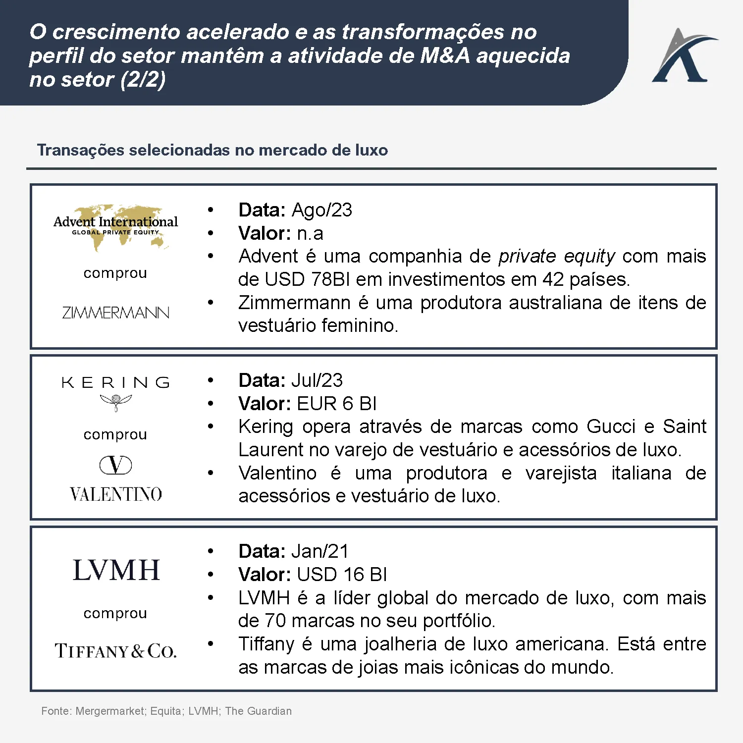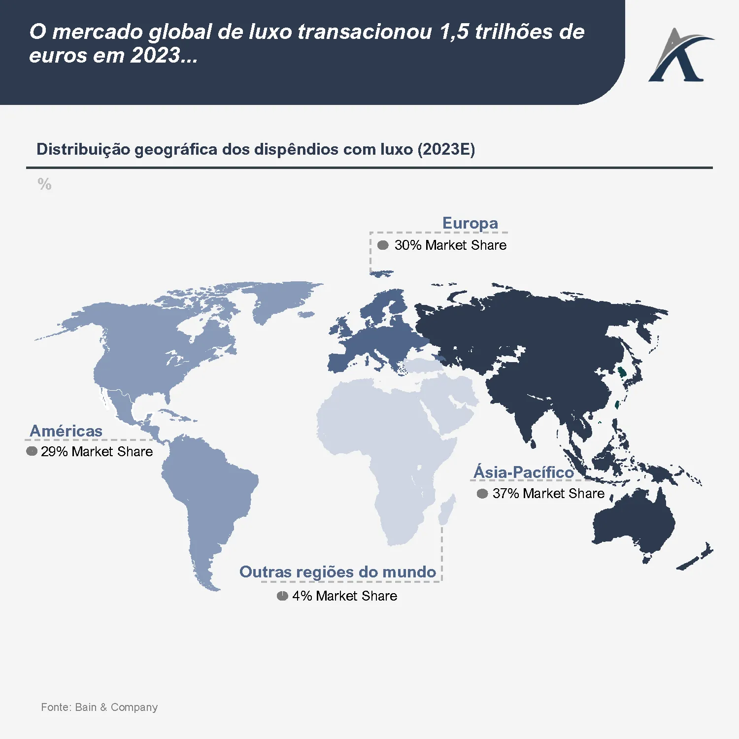 A Ásia é o principal mercado para o setor de luxo: seja pela alta demanda doméstica, como pelo aumento do fluxo de turistas chineses que têm realizado compras de artigos luxuosos. A Europa, 2º mercado mais importante do setor, também deve parte de seu crescimento à retomada do turismo nos últimos anos.
