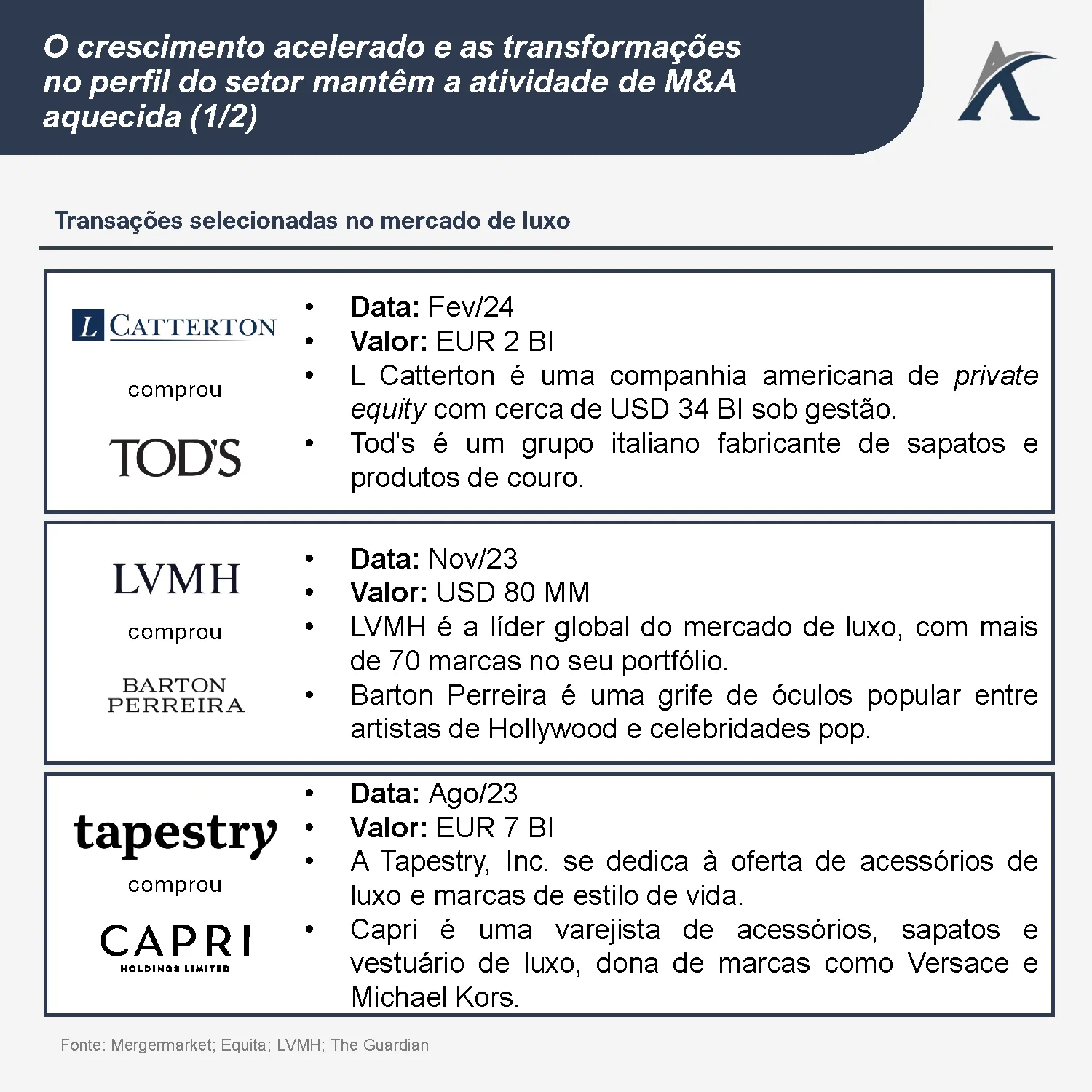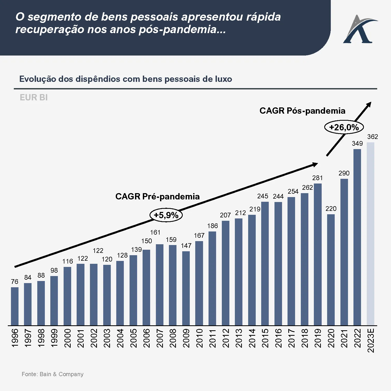 Depois de sofrer um golpe durante a pandemia de Covid-19, o mercado de produtos pessoais de luxo se recuperou velozmente – estima-se que tenha atingido 362 bilhões de euros em 2023. O setor deve continuar crescendo, impulsionado em especial pelas compras de bens de luxo realizadas por turistas – e já retornou a patamares próximos aos níveis pré-pandêmicos.