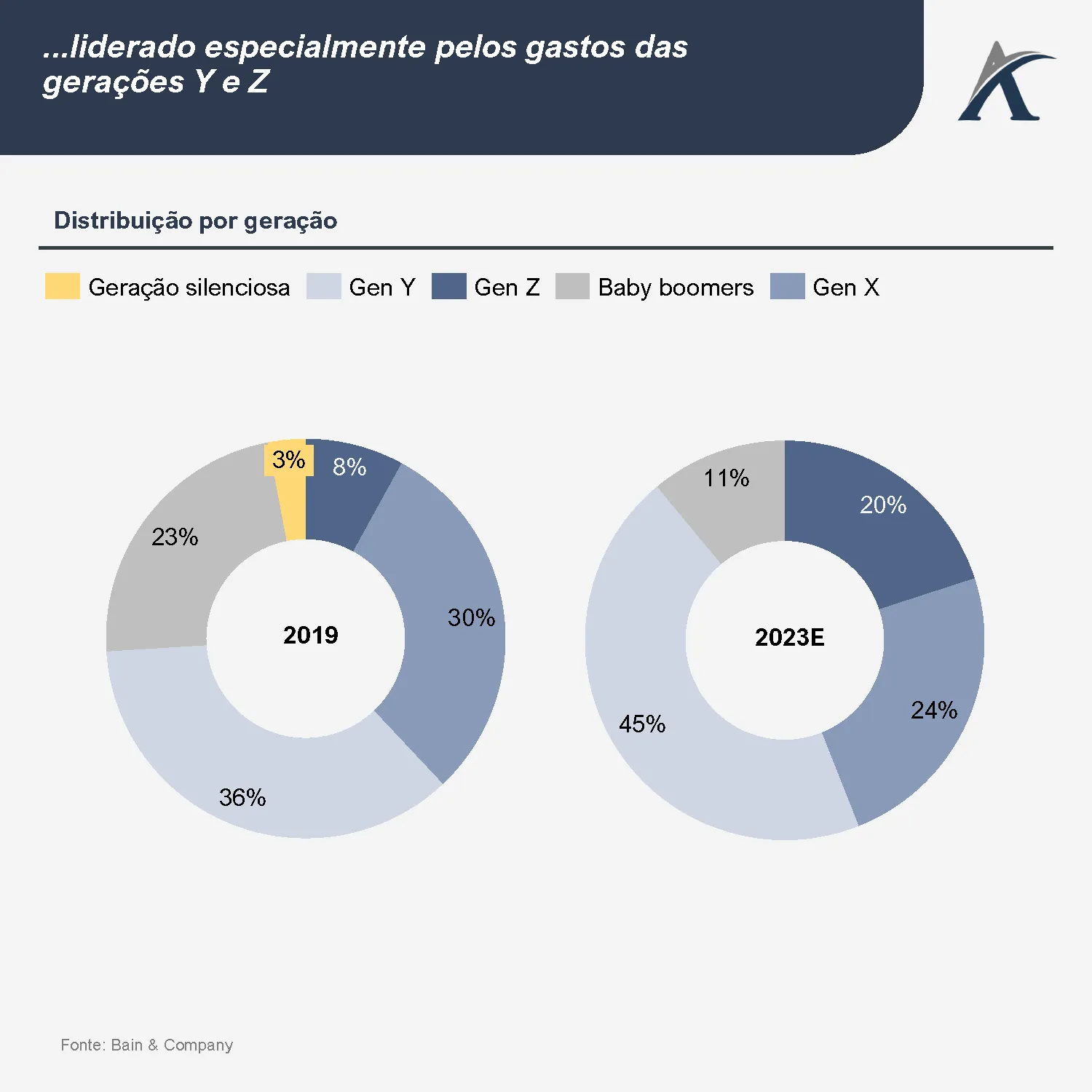 O mercado de luxo também sofreu transformações no perfil de seus compradores no período entre 2019 e 2023. Com os millenials se aproximando dos seus anos de maior geração de renda e a Geração Z de seus anos de maior influência cultural sobre o restante da sociedade, as Gerações Y e Z ganharam mais espaço nos dispêndios dentro do setor de bens de luxo.