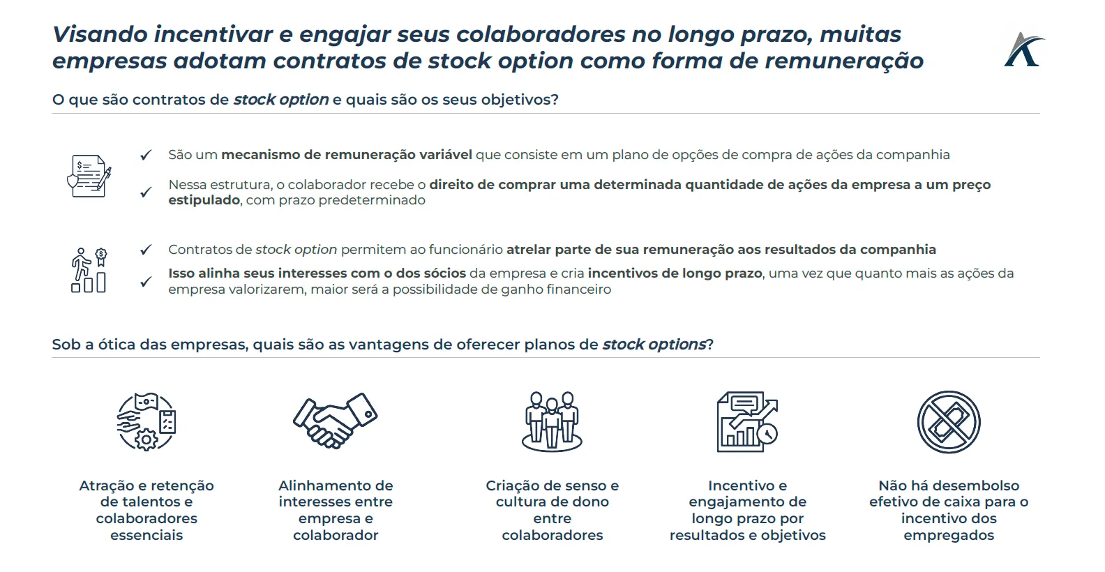 Entre os desafios inerentes ao crescimento de uma empresa, os funcionários são centrais e essenciais. Para incentivar e manter esses profissionais engajados, muitas empresas têm adotado modelos de remuneração LTI (Incentivos de Longo Prazo). Um dos modelos mais conhecidos nessa modalidade é a estruturação de planos de stock options, ou opções de ações.