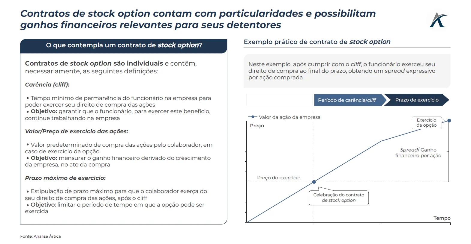 Nesse modelo de incentivos, o funcionário contemplado recebe o direito de adquirir ações da empresa por um preço abaixo do preço de mercado, por um determinado período de tempo. Ou seja, com o crescimento da empresa e virtual aumento do seu valor de mercado ao longo do tempo, o funcionário pode adquirir ações da companhia a um preço de exercício fixado anteriormente, antes da valorização. Em contratos de stock option, são indispensáveis as seguintes definições: