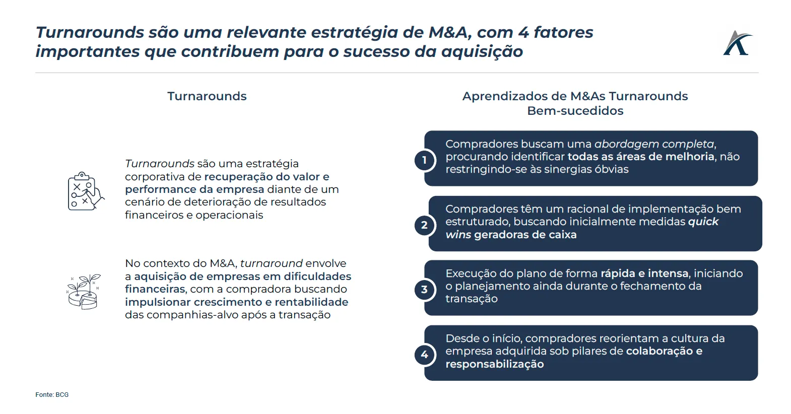 Os M&As turnarounds são uma das categorias de aquisição que se tornaram preponderantes, especialmente em momentos de crise. Esse tipo de transação está relacionado à aquisição de empresas em dificuldades financeiras e/ou operacionais, seguido de um processo de reestruturação da estratégia corporativa liderado pela compradora. Devido a isso, os riscos da operação são maiores que os usuais, mas um turnaround bem executado pode resultar em retornos expressivos para as compradoras.