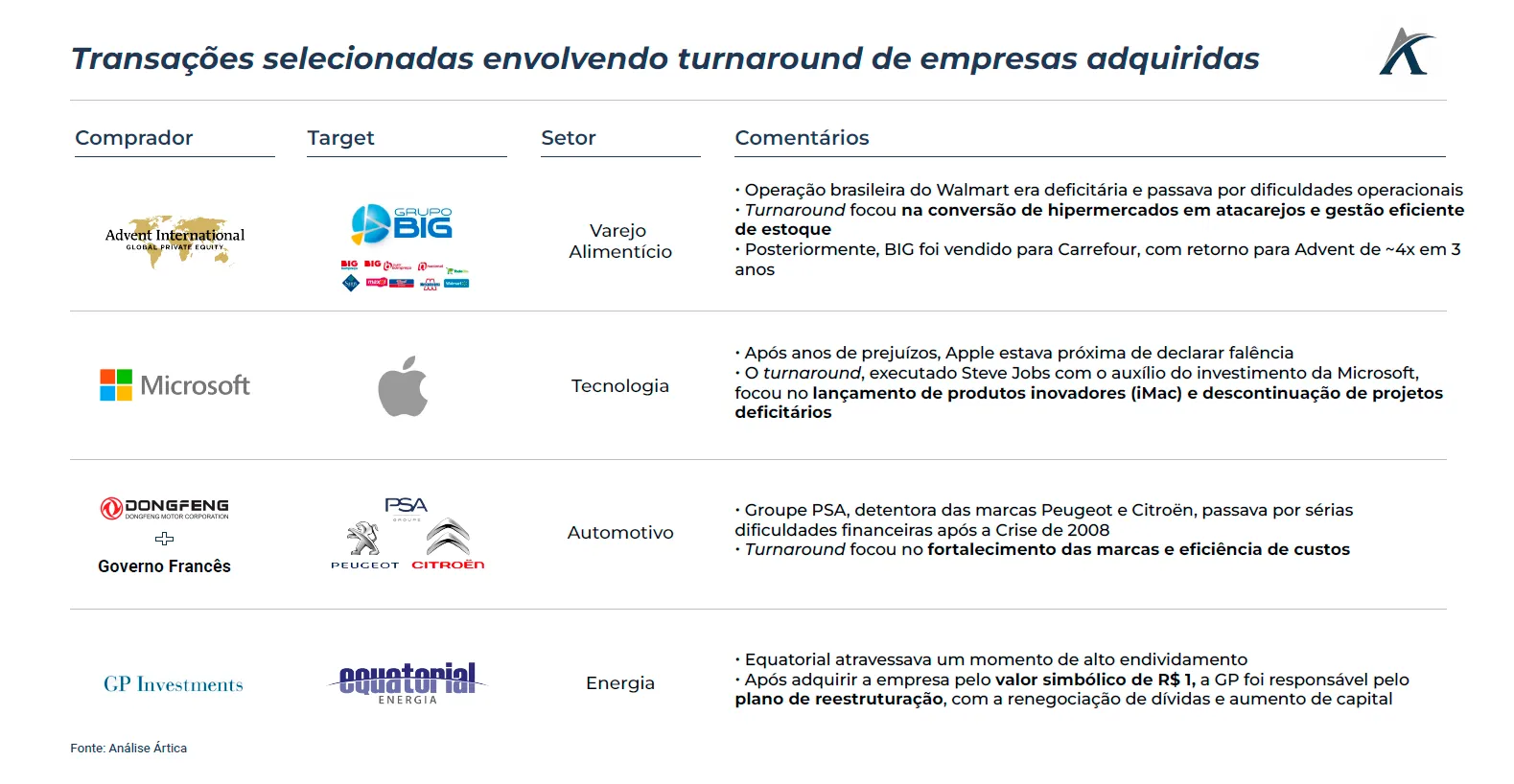 Um dos maiores M&As recentes no Brasil foi a compra do Grupo Big pelo Carrefour, em uma transação que deu saída à Advent em um dos mais bem-sucedidos turnarounds dos últimos anos. Em 3 anos, o fundo teve um retorno de ~4x, impulsionado por um intenso processo de reestruturação do grupo que controla marcas como Sam’s Club e Maxxi, mostrando o potencial de ganhos que esse tipo de operação pode gerar.