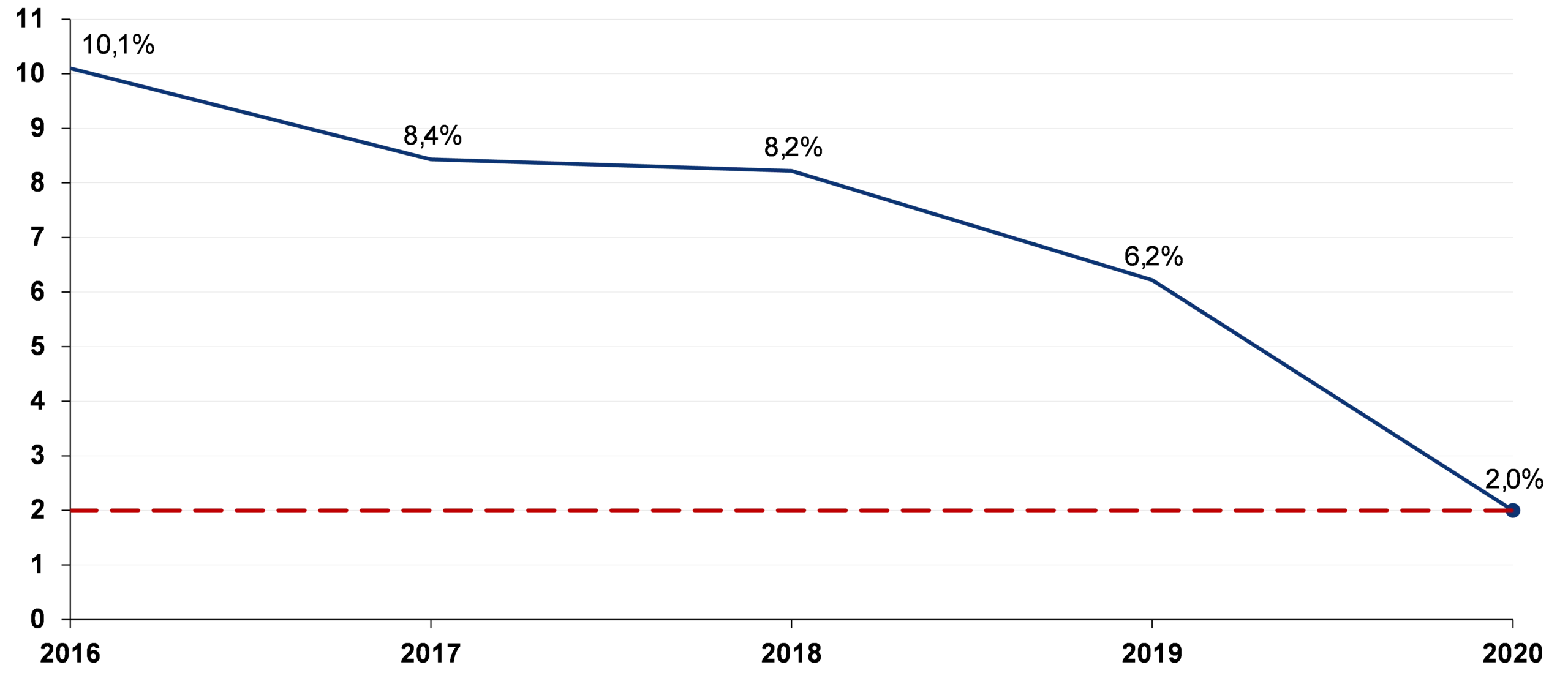 A interpretação do gráfico abaixo é: em 2016, o mercado projetava que a taxa SELIC de 2020 seria de 10,1%, em 2017, projetava que seria 8,4%, e assim por diante, até o ano de 2020, quando a taxa SELIC realizada foi de 2% . Observem que, se o mercado tivesse acertado a taxa realizada durante os 4 anos anteriores, o gráfico seria a linha vermelha pontilhada no gráfico.