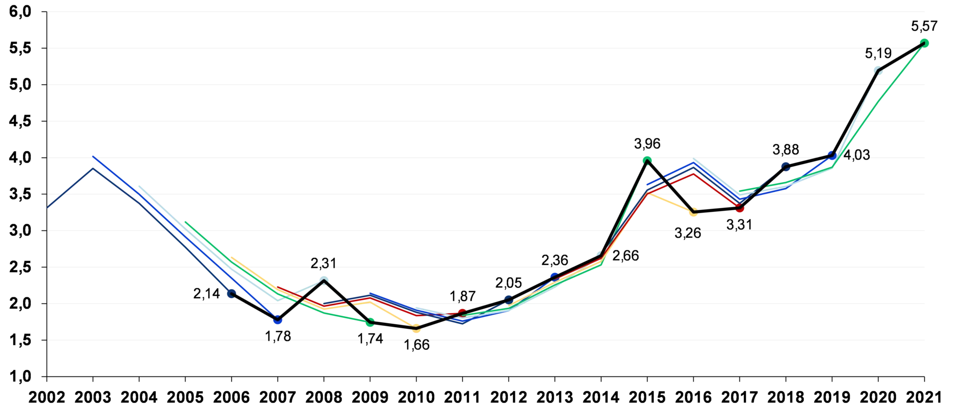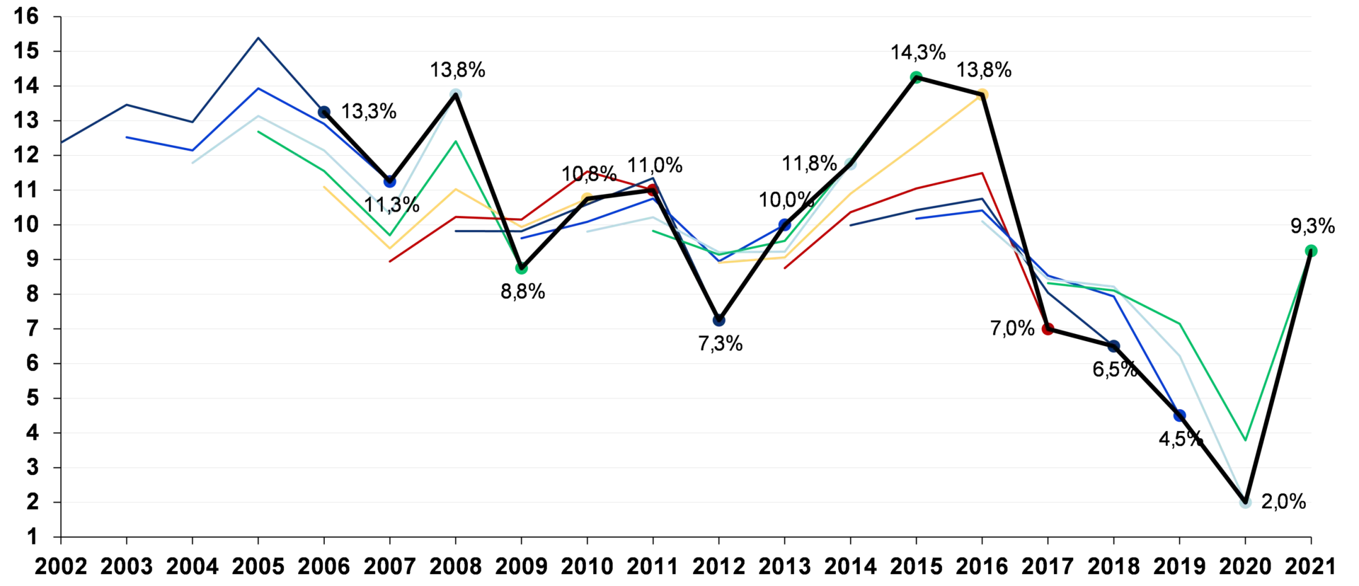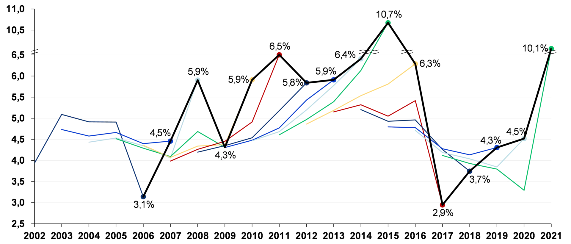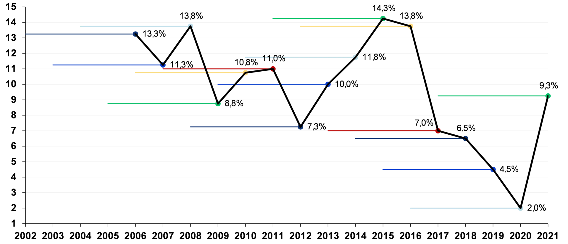 Observem como as projeções são bastante ancoradas na taxa de juros de cada momento. As projeções para a taxa SELIC de 2021 foram acompanhando a evolução da taxa entre 2017 e 2020, fazendo com que a projeção feita em 2020 para o ano seguinte estivesse mais errada do que a projeção feita em 2017 para 2021.