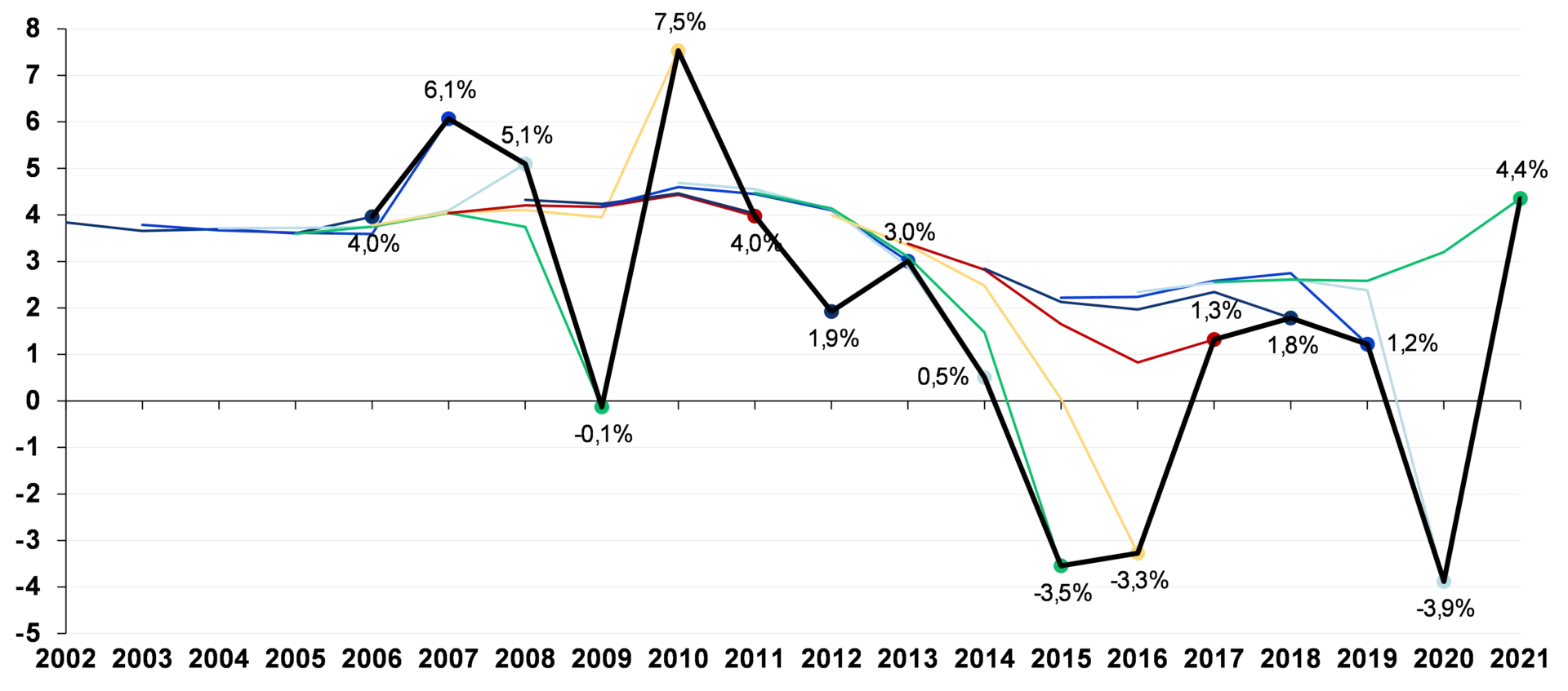 Nas projeções de PIB, o mercado parece considerar sempre uma taxa de crescimento média, entre 2-4%. Todos os anos de crescimento fora desta faixa não foram antecipados pelo mercado.