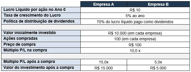 Se não estiver convencido, analise o seguinte exemplo, em que um investidor compra 100 ações de duas empresas idênticas, com apenas um detalhe diferente: o valuation da Empresa A sobe 50% logo após a compra e o da empresa B cai 50%.