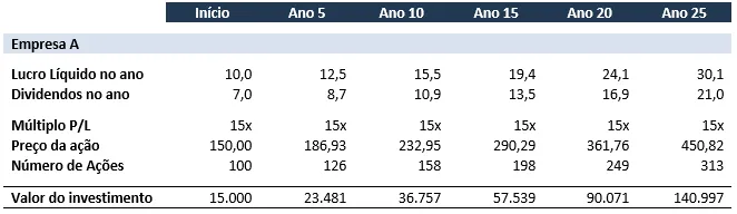 Assumindo que o múltiplo de valuation, alterado logo após a compra, permanecerá o mesmo para sempre, e que o investidor usará os dividendos recebidos para comprar mais ações da empresa que os distribuiu., vamos observar como evolui o patrimônio do investidor em cada uma das empresas.
