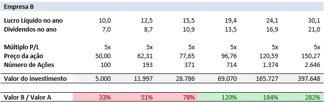 Apesar de, na Empresa B, o investidor começar com um prejuízo de 50% e um valor equivalente a 1/3 das ações na Empresa A, ele consegue comprar mais ações da Empresa B com os dividendos distribuídos por ela, devido ao valuation muito mais baixo. Ao longo do tempo, a Empresa B vai se tornando um investimento cada vez melhor e supera a Empresa A.