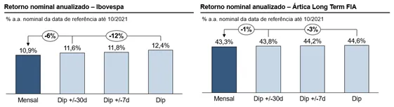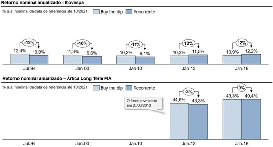 Desde o Plano Real, para o Ibovespa a estratégia buy the dip obteve um retorno anual nominal de 12,4%, +1,5p.p. acima da estratégia de aportes recorrentes, ou em outros termos, a estratégia recorrente obteve 88% do retorno total da estratégia buy the dip. Já para o Ártica Long Term FIA, desde sua fundação em junho de 2013, a estratégia de aportes recorrentes obteve 97% do retorno da estratégia buy the dip – que obteve um retorno de 44,6%.