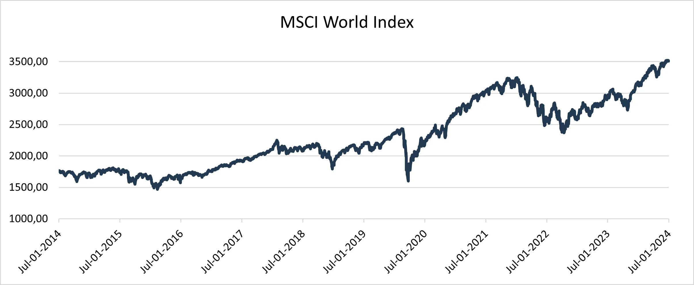 Um outro ângulo de visão que corrobora com a falibilidade da precificação do mercado é observar o quanto o preço das ações varia. O MSCI World Index é um índice que considera os preços de aproximadamente 1.500 empresas de 23 países desenvolvidos, que representam ~85% do valor total dos mercados de ações desses países. Ou seja, é amplo e diversificado o suficiente para ser uma boa representação da economia global. Os fundamentos por trás desse índice, quase que por definição, não podem ser muito voláteis, já que a economia global é um sistema enormemente complexo e bastante dependente de capital produtivo (infraestrutura, fábricas, máquinas, etc) e capital humano (grau de qualificação das pessoas), dois fatores que quase nunca variam muito em períodos curtos. Os tipos de eventos que poderiam causar grandes variações são revoluções tecnológicas, no sentido positivo, e catástrofes globais da ordem de grandeza de guerras mundiais, no sentido negativo. No entanto, esse é o gráfico do MSCI World Index nos últimos 10 anos: