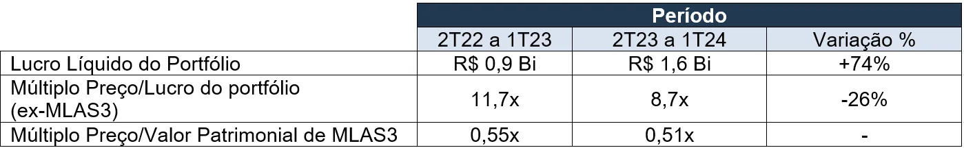 Devido a essa melhora substancial nos resultados de nossas empresas investidas, o Ártica Long Term FIA subiu cerca de 20% nos últimos 12 meses. Porém, o múltiplo Preço/Lucro de nosso portfólio atual de empresas brasileiras está mais baixo do que antes. Segregamos Multi (MLAS3) por causa do lucro líquido negativo de 2023, que torna o múltiplo Preço/Lucro sem sentido, o múltiplo de Preço/Valor Patrimonial se manteve estável mesmo com melhores perspectivas para a empresa hoje.