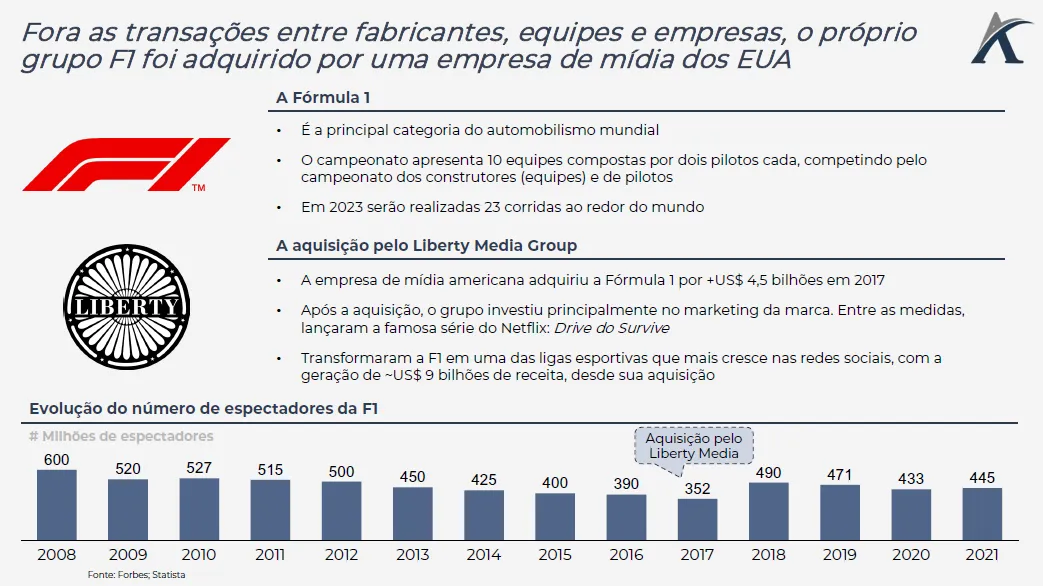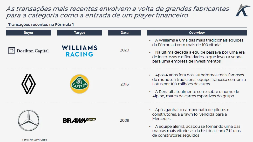 A principal categoria do automobilismo mundial, a Fórmula 1, apresenta um mercado muito aquecido em transações de M&A. Essas transações acontecem desde seus primeiros anos de criação, na década de 1950, até os dias de hoje.