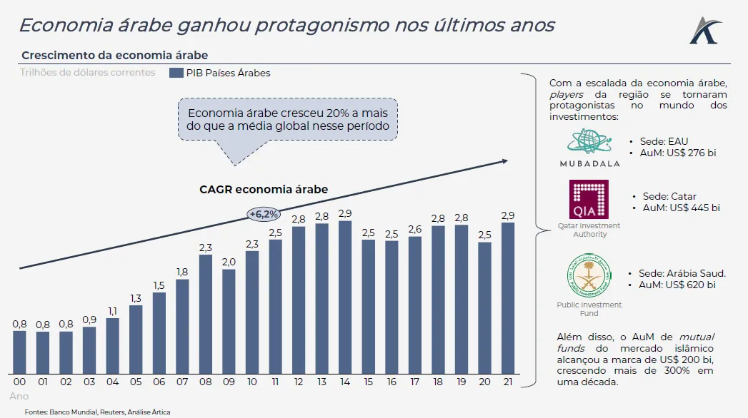 Os países árabes têm conquistado uma posição de destaque no mercado financeiro internacional, especialmente desde que começaram a reinvestir os lucros provenientes do petróleo em outras indústrias, com o objetivo de diversificar seus ativos. Como resultado, os fundos soberanos de países árabes têm ganhado reconhecimento e têm sido frequentemente mencionados nas notícias financeiras internacionais.
